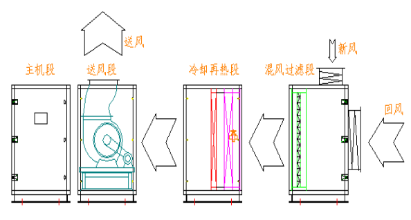 混風(fēng)過濾段:使新風(fēng)和回風(fēng)進行混合,并對混合空氣進行過濾處理,主要包括新風(fēng)法蘭、回風(fēng)法蘭和初效過濾器。